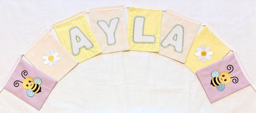 I take requests for these personalised bunting orders. The personalised element is the addition of a child's name added to the bunting to be custom for them.