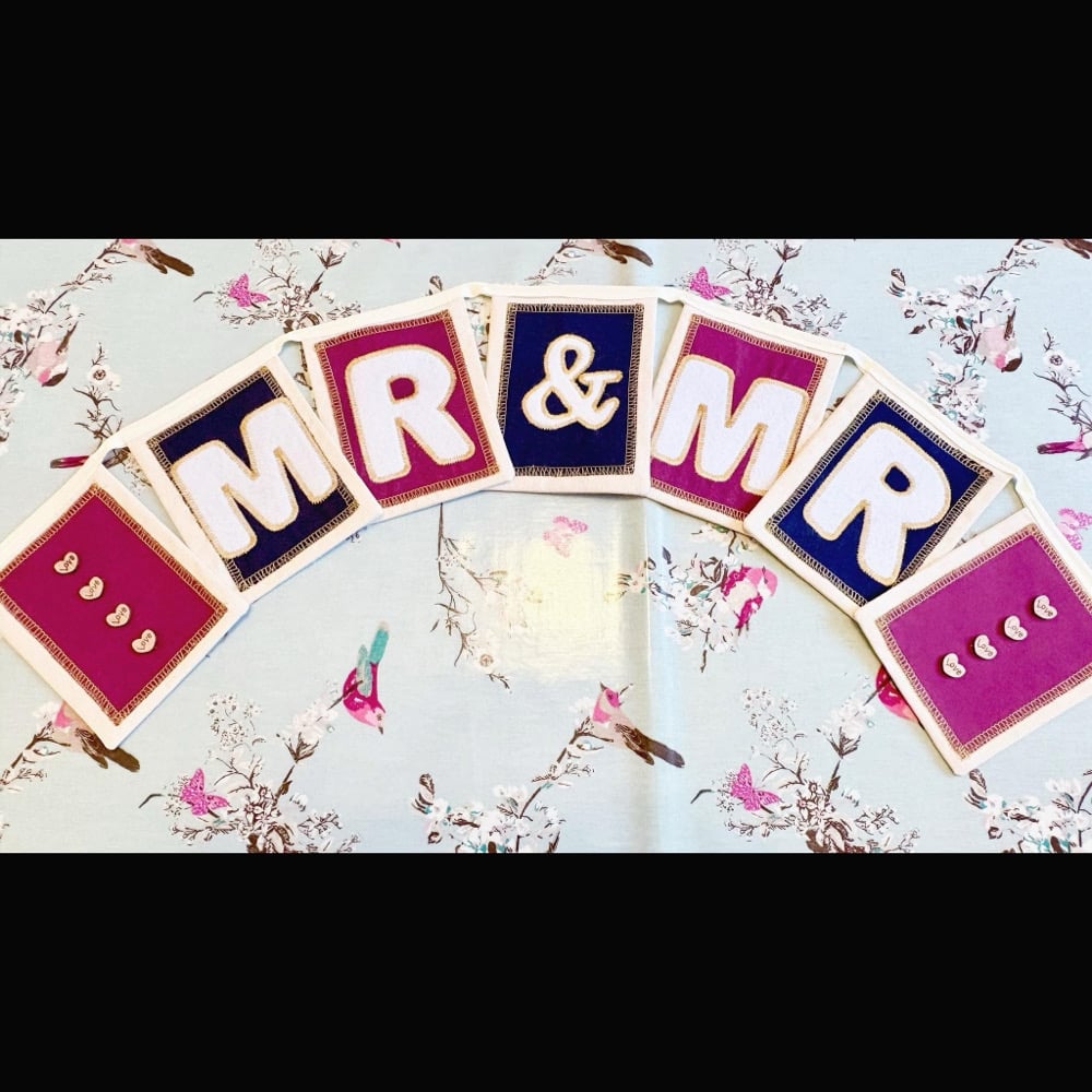 This personalised wedding bunting shown is NOT available to purchase. I made this on request for a customer's wedding gift back in 2018. I do however take requests for orders. The personalised element is the addition of the couples titles added to the bunting to be custom for them.